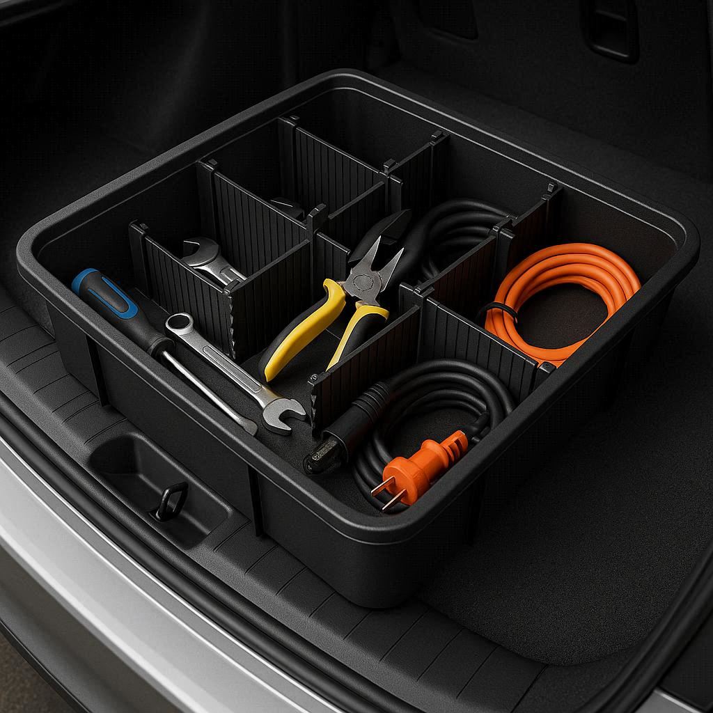 Designed for modern cars, featuring adjustable dividers to hold tools, cables, and personal belongings securely.