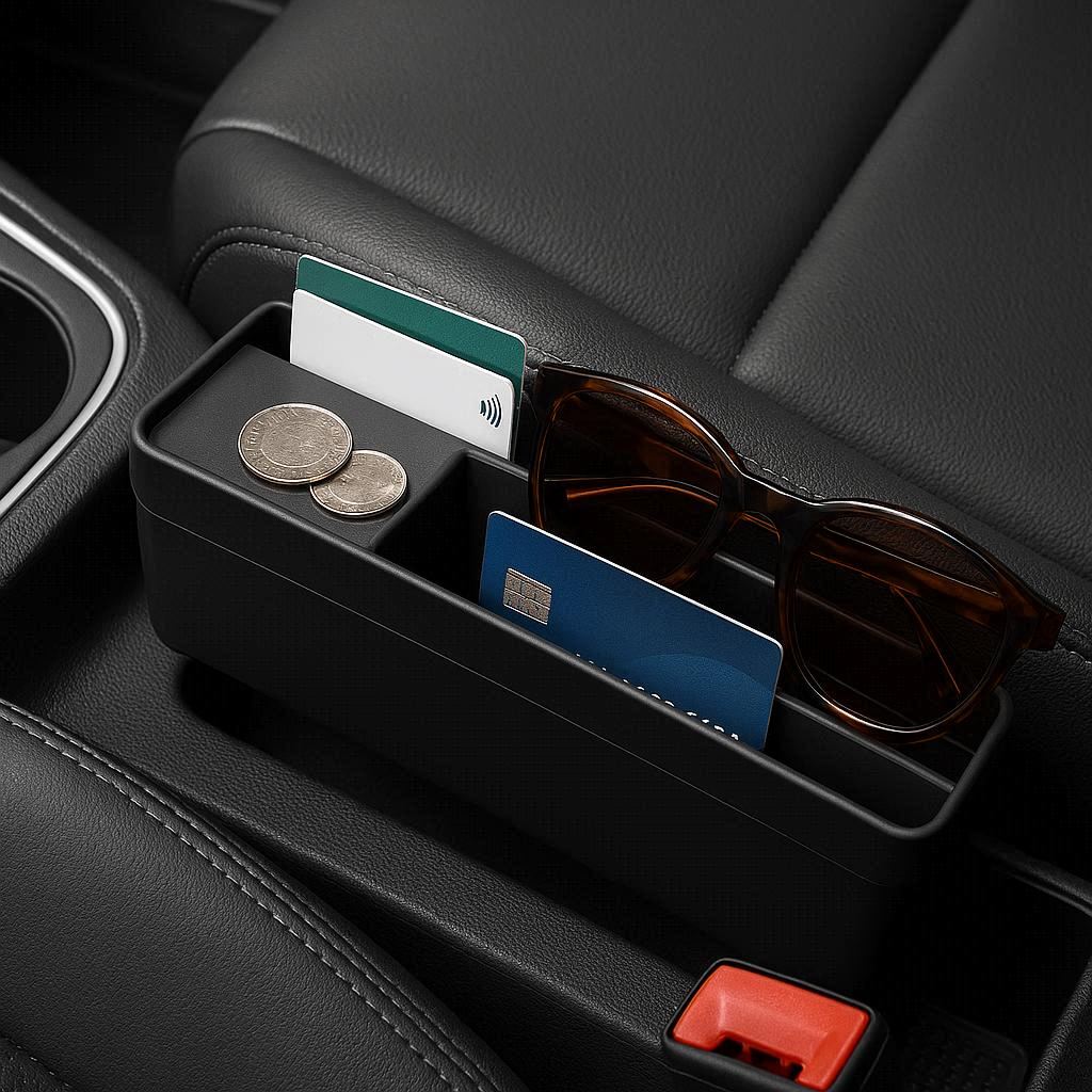 Fits snugly in console gaps, offering quick access to coins, cards, and sunglasses with a snap-lock design.